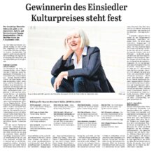 Die Kulturkommission Einsiedeln würdigt mit dem Preis «das langjährige und engagierte kulturelle Schaffen der Eggerin Susann Bosshard-Kälin; sie dankt der Journalistin, Autorin und Brückenbauerin insbesondere für die Erschaffung von regional sowie überregional relevanten und identitätsstiftenden Zeitzeugnissen.»